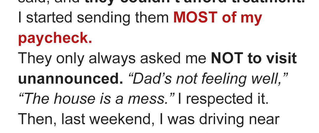 Every time I transferred the money, I imagined it softening something. A pill bought, a bill paid, a brief moment of peace in a house full of worry. I pictured Dad sleeping easier. Mom drinking her tea without shaking hands.
