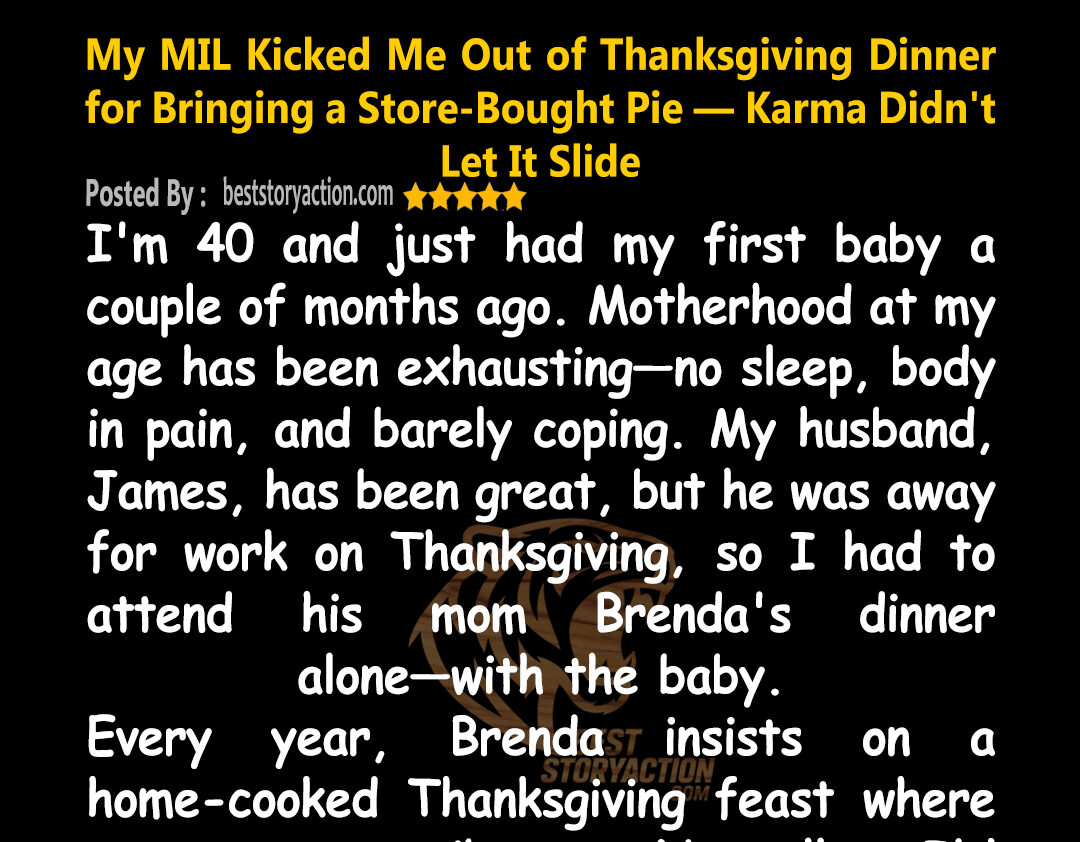 Overwhelmed by new motherhood at forty, all Clem could manage for her mother-in-law Brenda’s perfect Thanksgiving dinner was a store-bought pie. Unimpressed, Brenda humiliated her in front of the guests and sent her packing. But when James, Clem’s husband, returned unexpectedly, karma stepped in. What began as a Thanksgiving disaster evolved into a reckoning for Brenda and the surprising start of a stronger family bond.