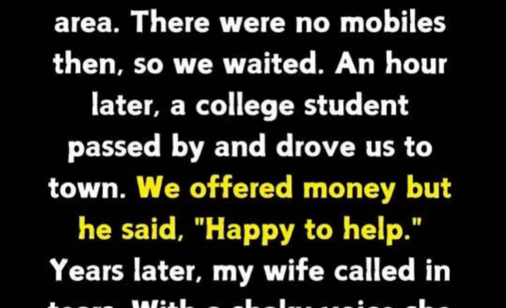 Story 1: At two in the morning, my wife and I were driving back from a party when our car broke down in a far-off place. We waited because there were no cell phones back then. After an hour, we were driven to town by a college student who happened to be passing by. He responded, “Happy to help,” when we offered money.