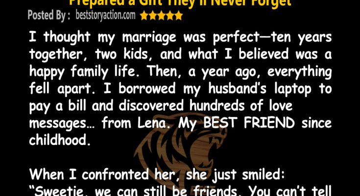 It was a collage of photos: Mark and me, arm in arm with Lena, smiling at the park. Lena laughing at my kitchen table, her hand on Mark’s shoulder. One of her decorating our Christmas tree, standing just behind the kids. And at the center, our wedding photo — Mark and I, young, naïve, and very much in love.