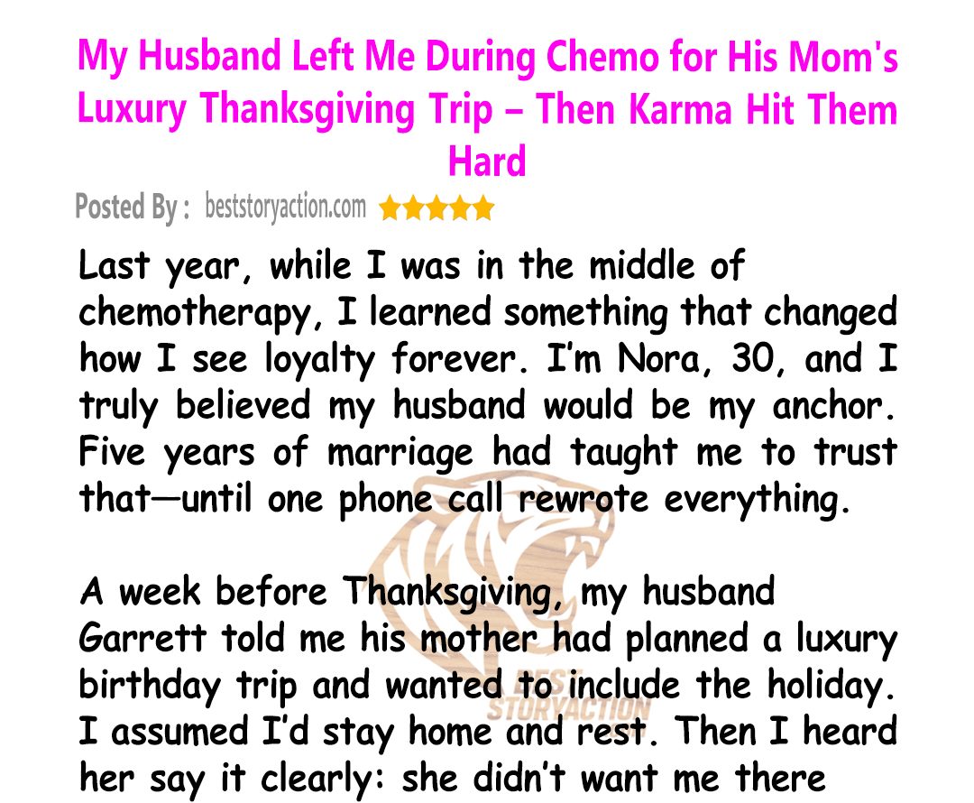 “My husband left for a luxury vacation while I’m mid-chemo,” I said, my voice steadier than I expected. I imagined myself standing in a courtroom with a silk scarf around my head and a beautiful pantsuit.