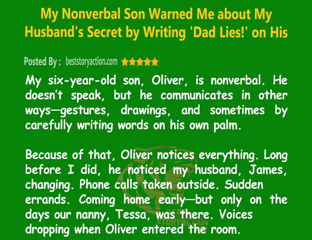 My husband’s early returns from work — always when our nanny was still there — set off alarm bells. But it was our nonverbal six-year-old, Oliver, who saw the truth. His warning, “Dad lies!” written on his palm in marker, led me to uncover a secret that would shatter our world.
