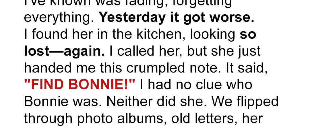 Margaret’s world was slipping, memories fading like ink on old paper. But one thing remained clear—a name in shaky handwriting: “Find Bonny.” She didn’t know who Bonny was, but she knew she had to find her. As her daughter watched with quiet concern, Margaret clung to the one truth she had left.
