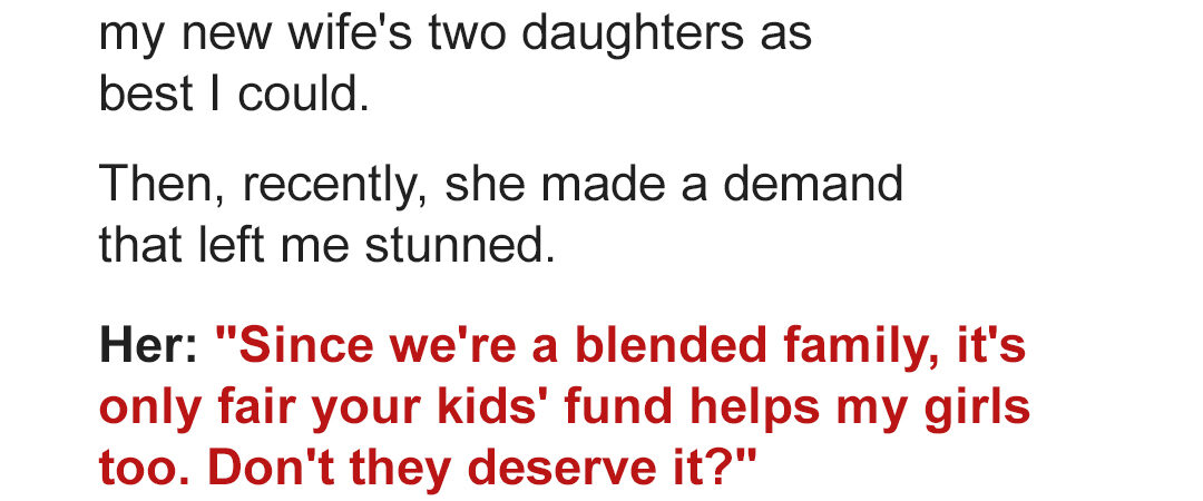 “Treated them like your own? Please. If that were true, you wouldn’t be hoarding that money for just your biological kids.”