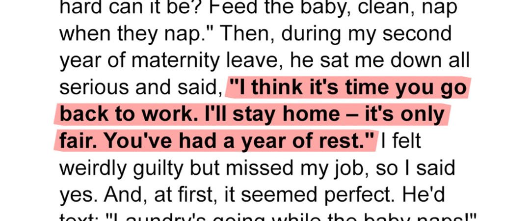 “I thought it would be easy,” he said, not meeting my eyes. “I hated my job. Absolutely hated it. And when I suggested I’d stay home, part of me was looking for an escape.”