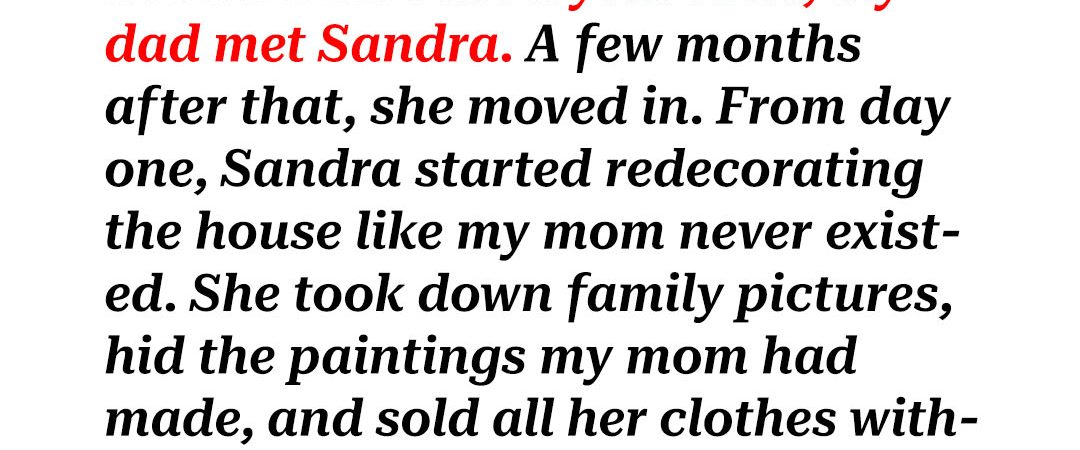 Sandra started “freshening up” the house. That was her phrase, freshening up. But what it really meant was erasing my mother. The framed family photos disappeared from the hallway.