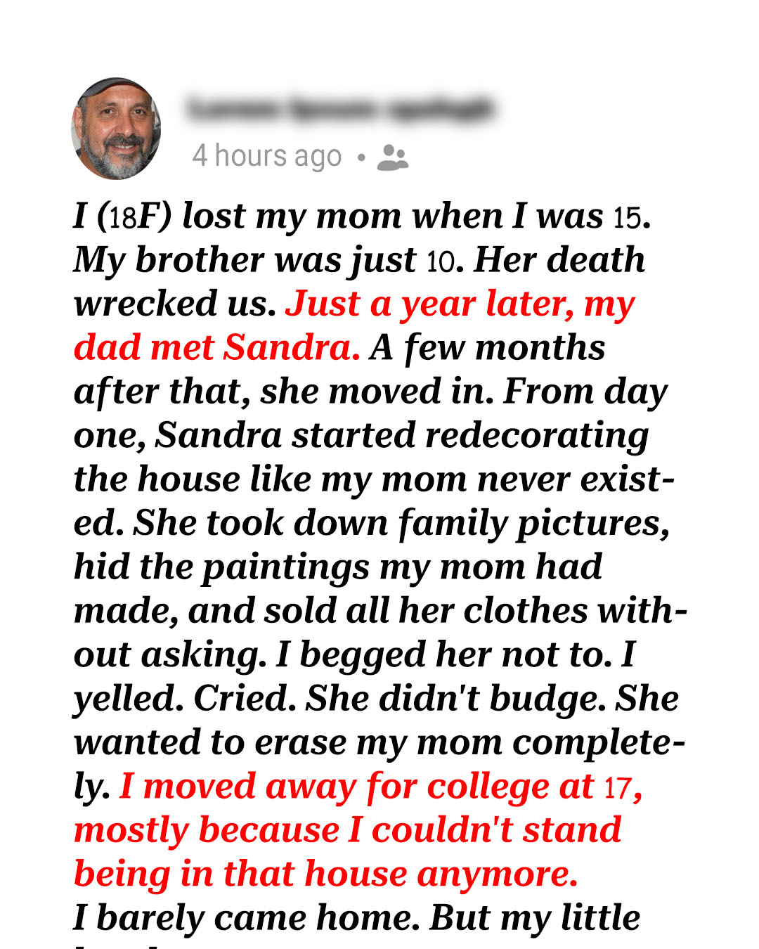 Sandra started “freshening up” the house. That was her phrase, freshening up. But what it really meant was erasing my mother. The framed family photos disappeared from the hallway.