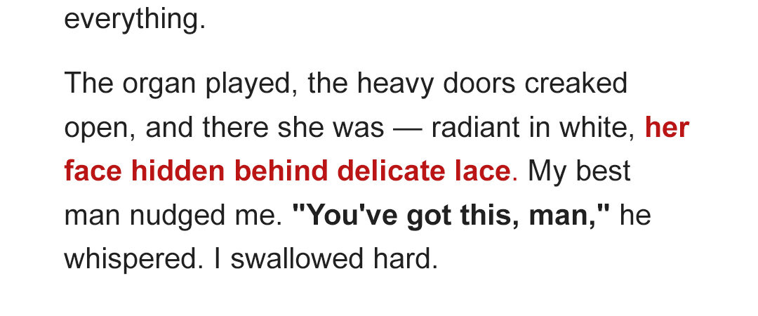 Step by step, she made her way down the aisle, her father guiding her arm. I couldn’t take my eyes off her, but something felt… strange. Her movements were stiff and her posture rigid. She wasn’t looking at me, not the way she always did.