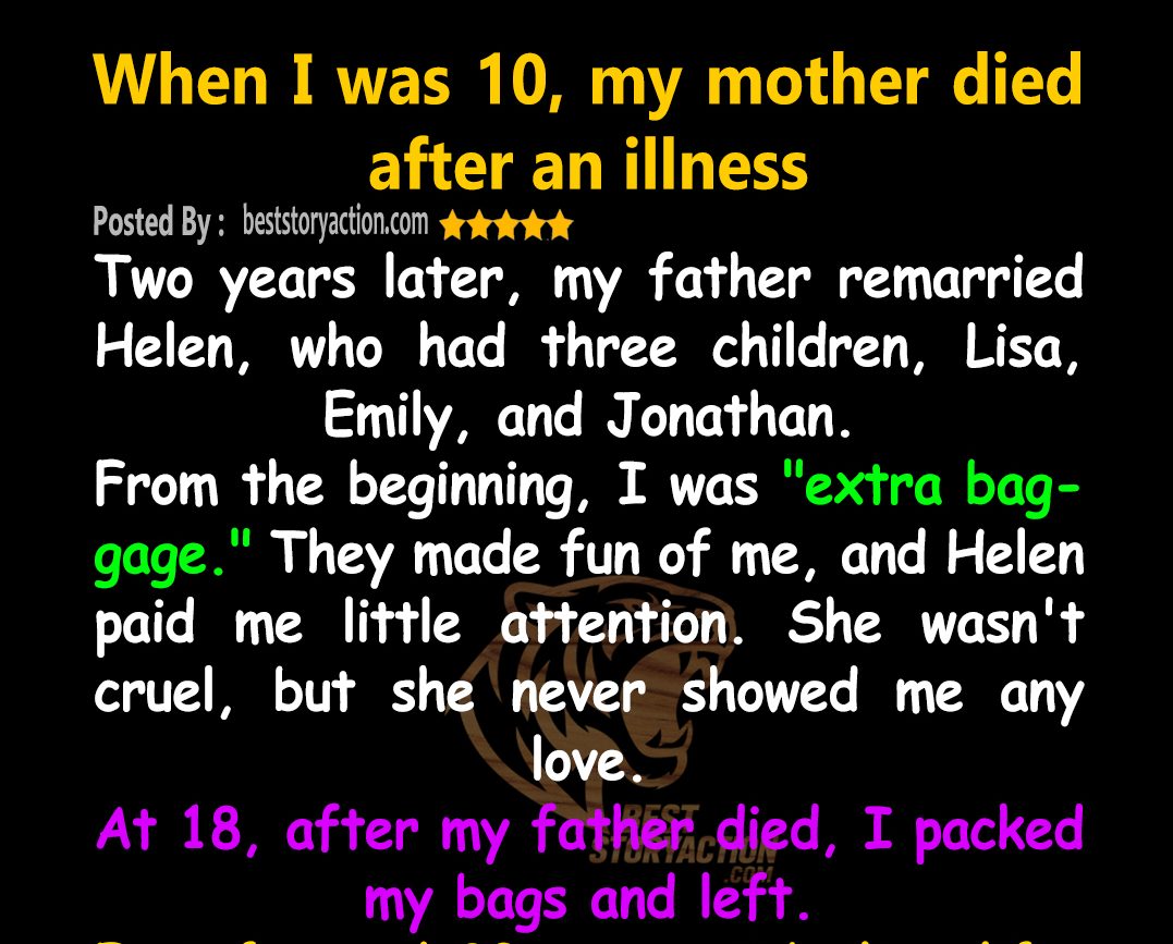 When I turned eighteen, the weight of it all finally broke me. “I can’t do this anymore,” I whispered to myself as I zipped up my suitcase. By then, my father had already passed, and leaving meant cutting ties not just with Helen but with the entire painful chapter of my life.
